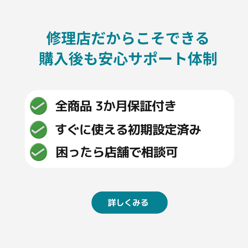 修理店が1台ずつ整備・検品した中古PCのみを販売しています。